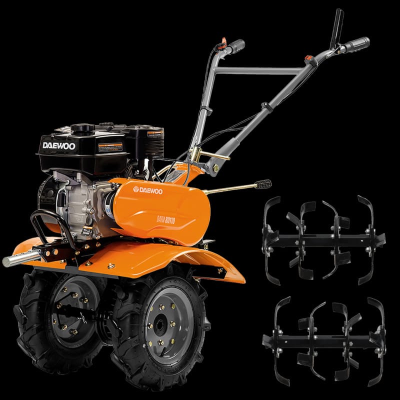 Опис:Моќниот и издржлив DAEWOO DATM80110 мотокултиватор е создаден за ефикасна обработка на различни типови почви. Опремен е со едноцилиндричен 4-тактен бензински мотор од 7.0 коњски сили (212 cc), кој обезбедува стабилни перформанси и долготрајна работа. Благодарение на ременскиот пренос и менувачот со 2 брзини напред и 1 назад, управувањето е лесно и прецизно.