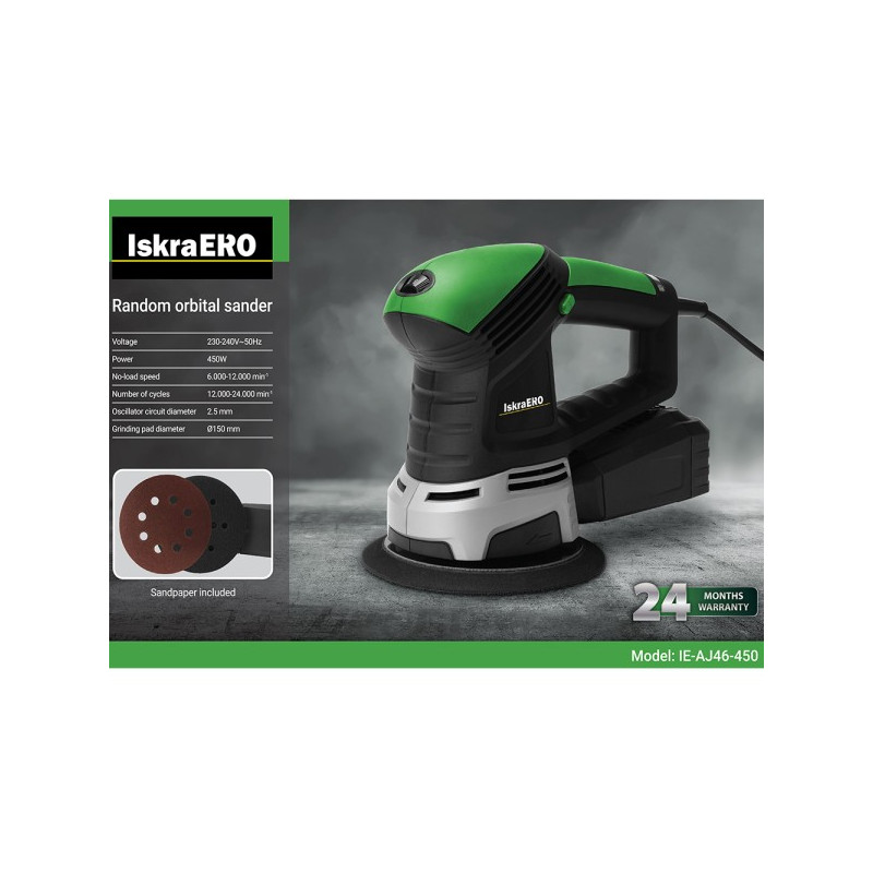 • Моќност: 230-240V~50Hz• Јачина: 450W• Број на вртежи на моторот: 6.000 – 12.000 min-1• Број на вибрации: 12.000 – 24.000 min-1• Пречник на вибрациски круг: Ø150 mm• Брусна плоча: Ø150 mm• Сад за собирање прашина• Димензии (mm): 290 x 125 x 190• Тежина: 2 kg2 години гаранција