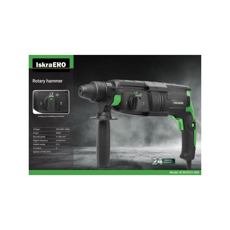 • Напон: 230-240V ~ 50Hz• моќност: 850W• Сила на удар: 3,3 Ј• брзина без оптоварување:- Дупчење: 0-1300 мин-1- удирање: 0-5100 мин-1• систем за приклучок SDS Plus• дополнителна рачка• макс. дупчење капацитет:- челик: Ø 13 mm- бетон: Ø 26 мм- дрво: Ø 30 мм• опрема:- конусна длето 14×250 mm- рамна длето 14×250 mm- бутгии 8/10 / 12×150 mm• Димензии на пакувањето (во мм): 400 (L) x 110 (W) x 280 (H)• Нето тежина: 3 кг• Бруто тежина: 5,6 кг