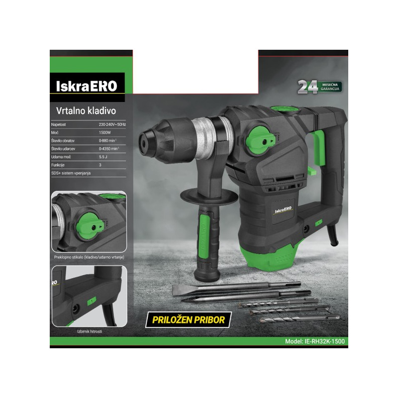 Карактеристики:Напон: 230-240V ~ 50HzМоќност: 1500W (max)Ударна моќ: 5.5 JБрзина без оптоварување:• при вртење: 0–880 min-1• при удар: 0–4350 min-1Максимално дупчење на:• железо: 13 mm• бетон: 32 mm• дрво: 42ммДодатоци:• плоснато длето: 14×250 mm• конусно длето: 14×250 mm• сврдел: 8,10,12×150 mm• заштита од прашинаSDS+ системДодатна рачкаГаранција 24 месециБесплатна достава