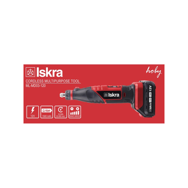 • Напон: 12V• Моќност: Li-ion батерија (1.5Ah)• Брзина на мирување: 10,000-22,000 / мин-1• Избор на брзина: 1-5• Глава за затегнување: ø 2,3 – 3,2 мм• Димензии на пакетот (во мм): 240 (L) x 100 (W) x 95 (H)Гаранција – 2 години